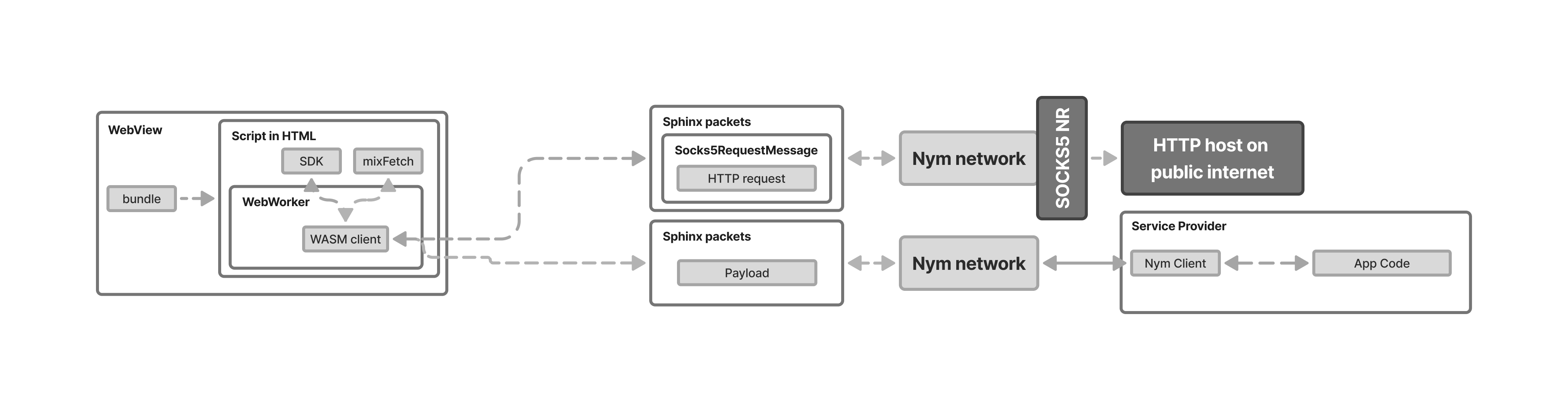 Both mixFetch and the WASM client are delivered to the client bundled into a web application.