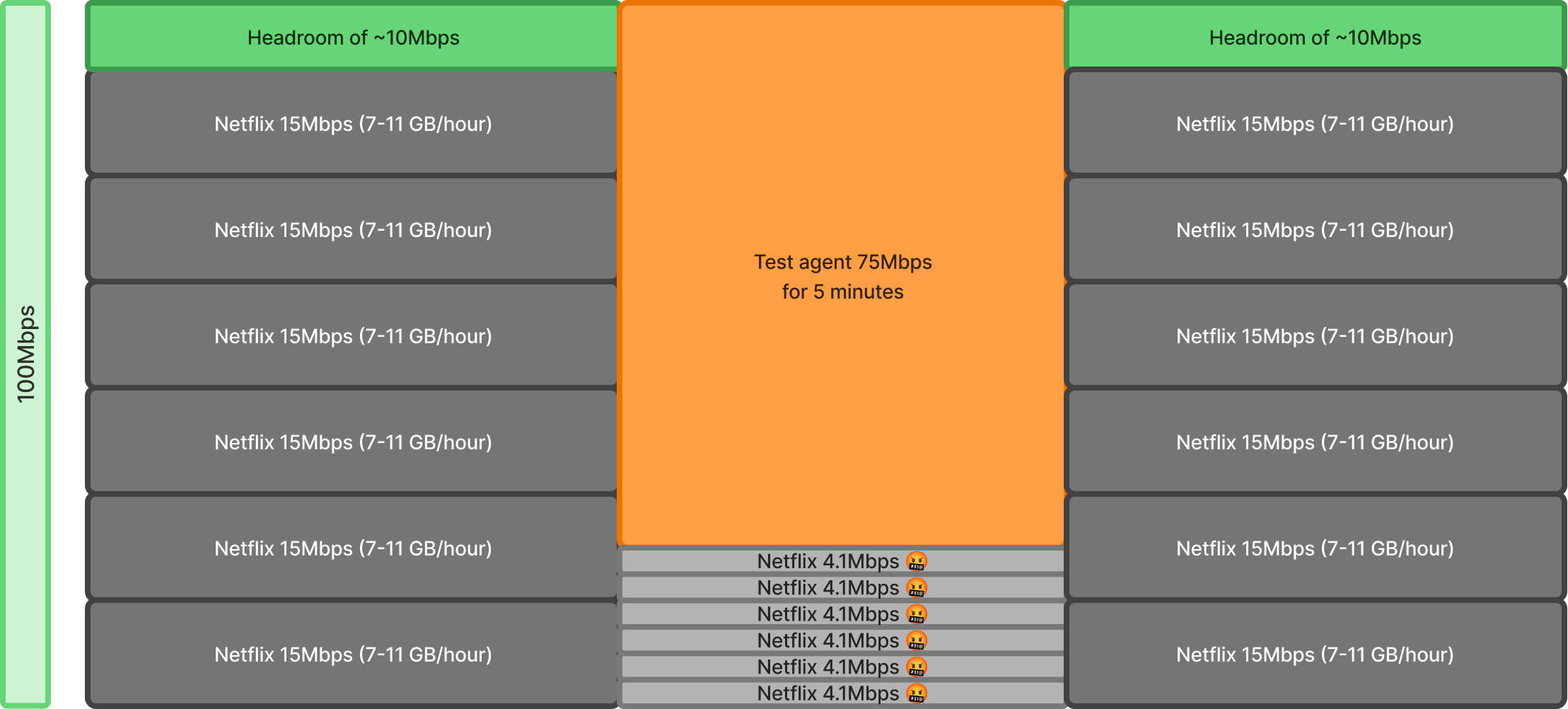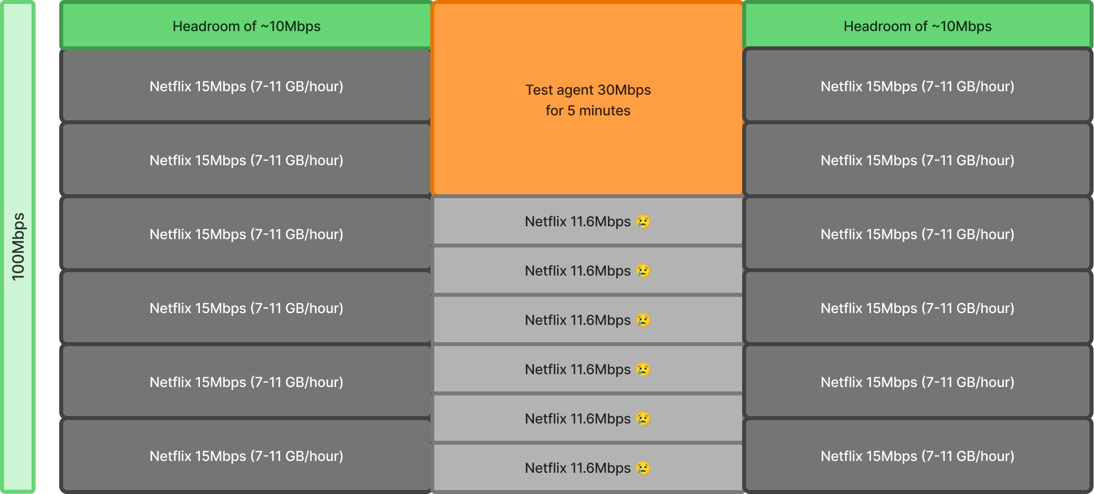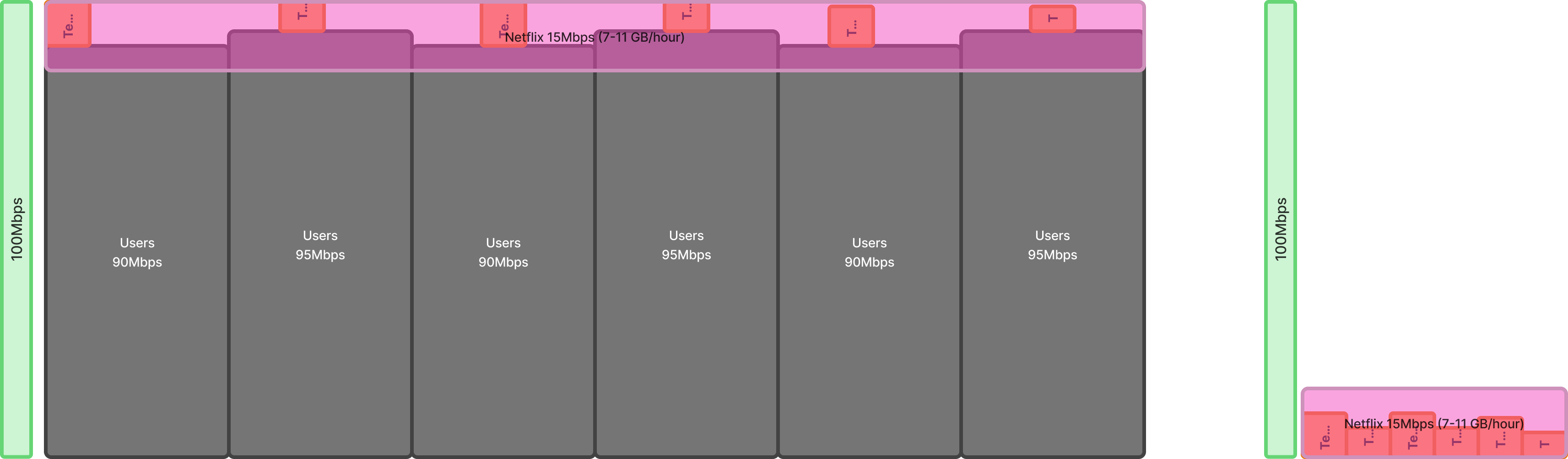 Imagine there are 6 * Netflix 4k users on a 100Mbps Gateway, let's look at different traffic stream scenarios: